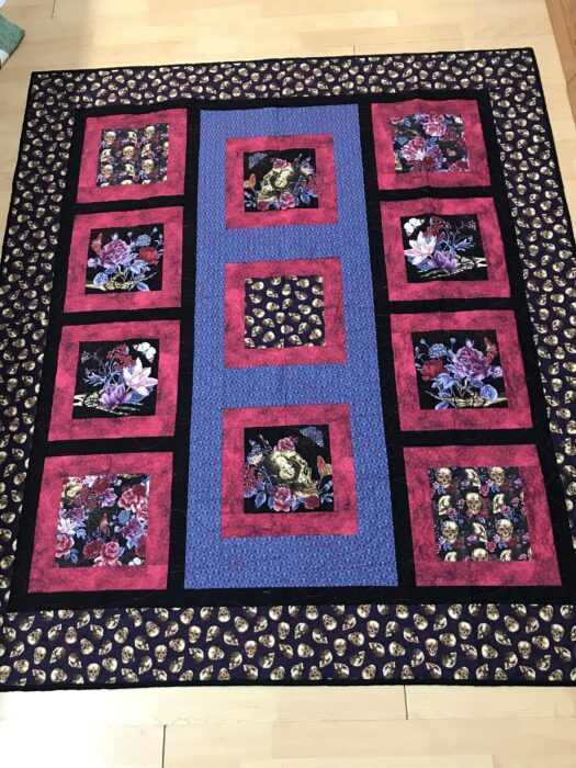 Finished size is 59″ x 67″. Beginner friendly quilt kit, contains the fabrics for the top, binding, and the pattern. All 100% cotton fabrics. The fabrics give the look of metallic, but they are not. Catch all those skulls in among the pink and purple fabrics.