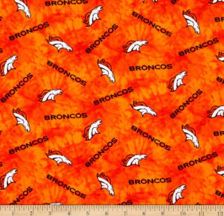 Orange and yellow tie-dye background with words and the Denver Bronco logo in a tossed all over pattern. 100% cotton flannel. 44″-45″ wide.